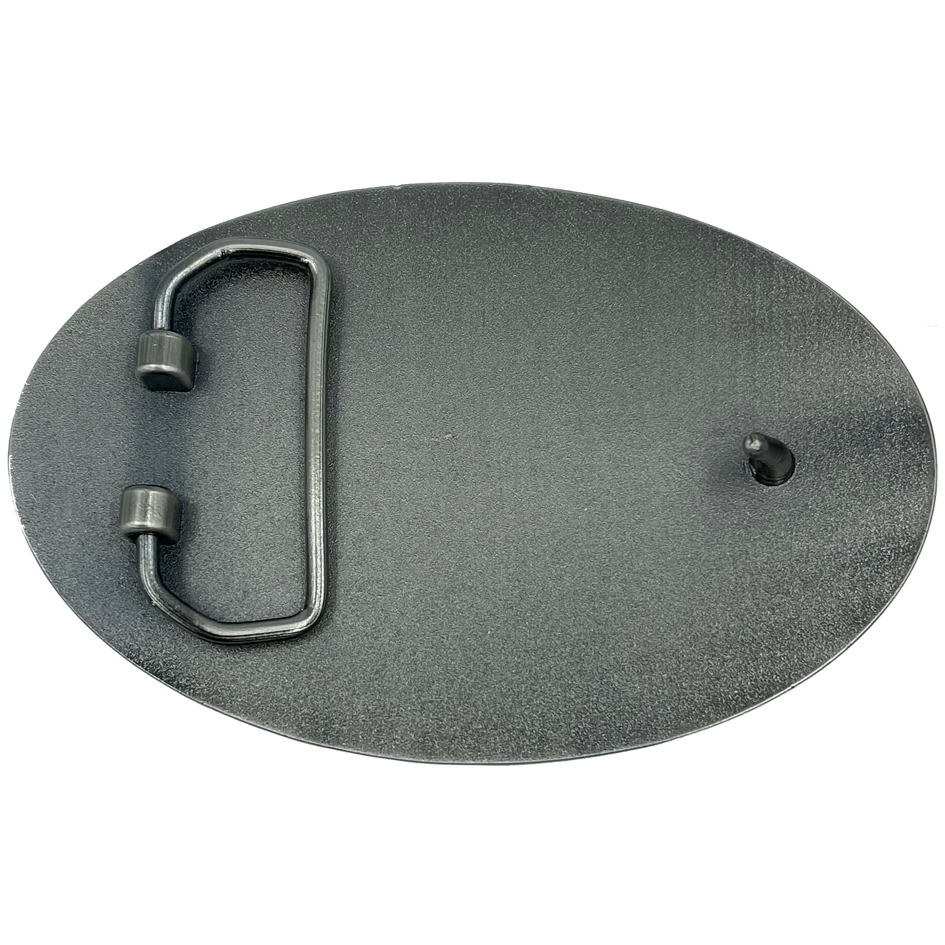 4.5 inch wide belt buckle. Will fit belts up to 2 inches. Antique nickel plated with paint applied enamel. Designed by a Veteran Law Enforcement Officer.