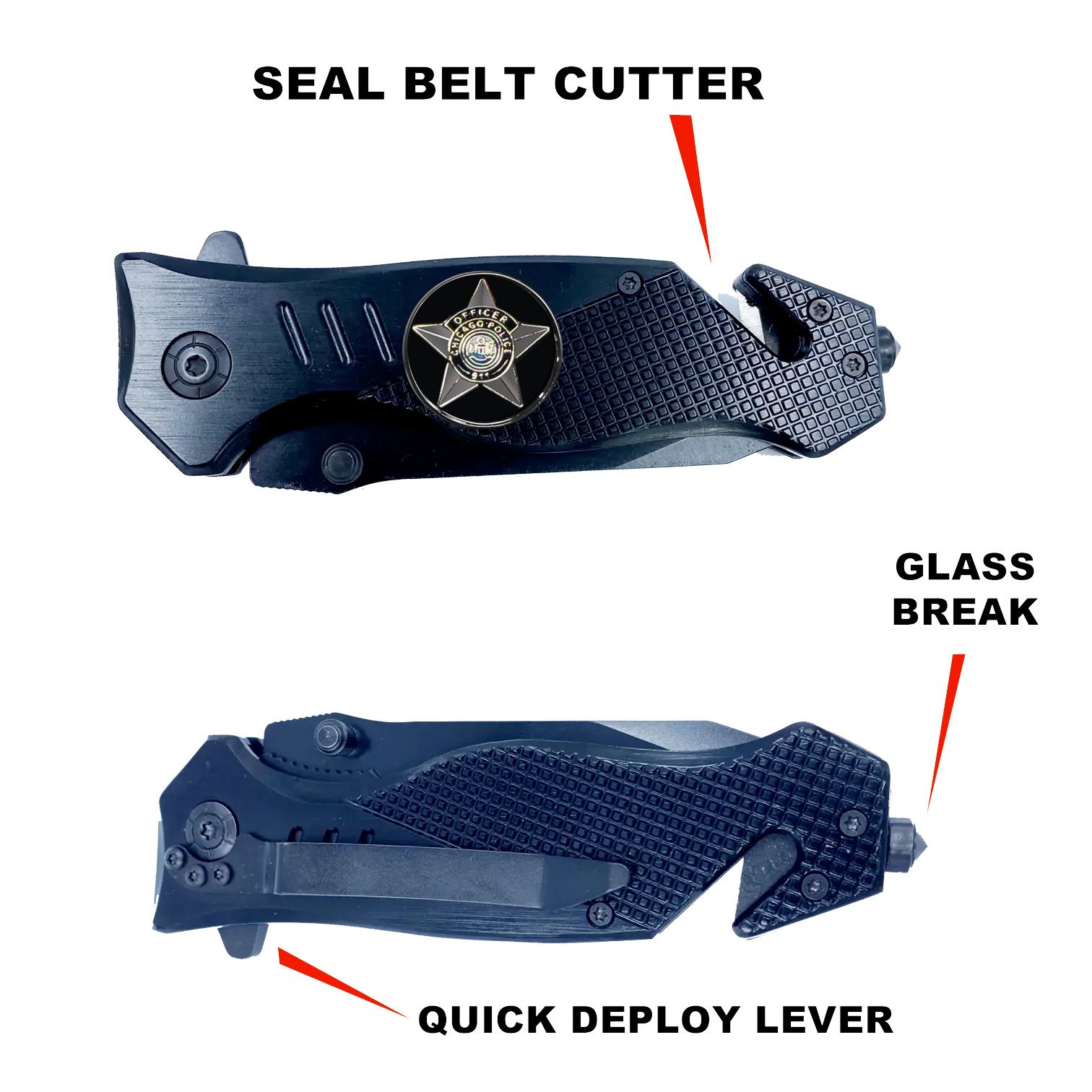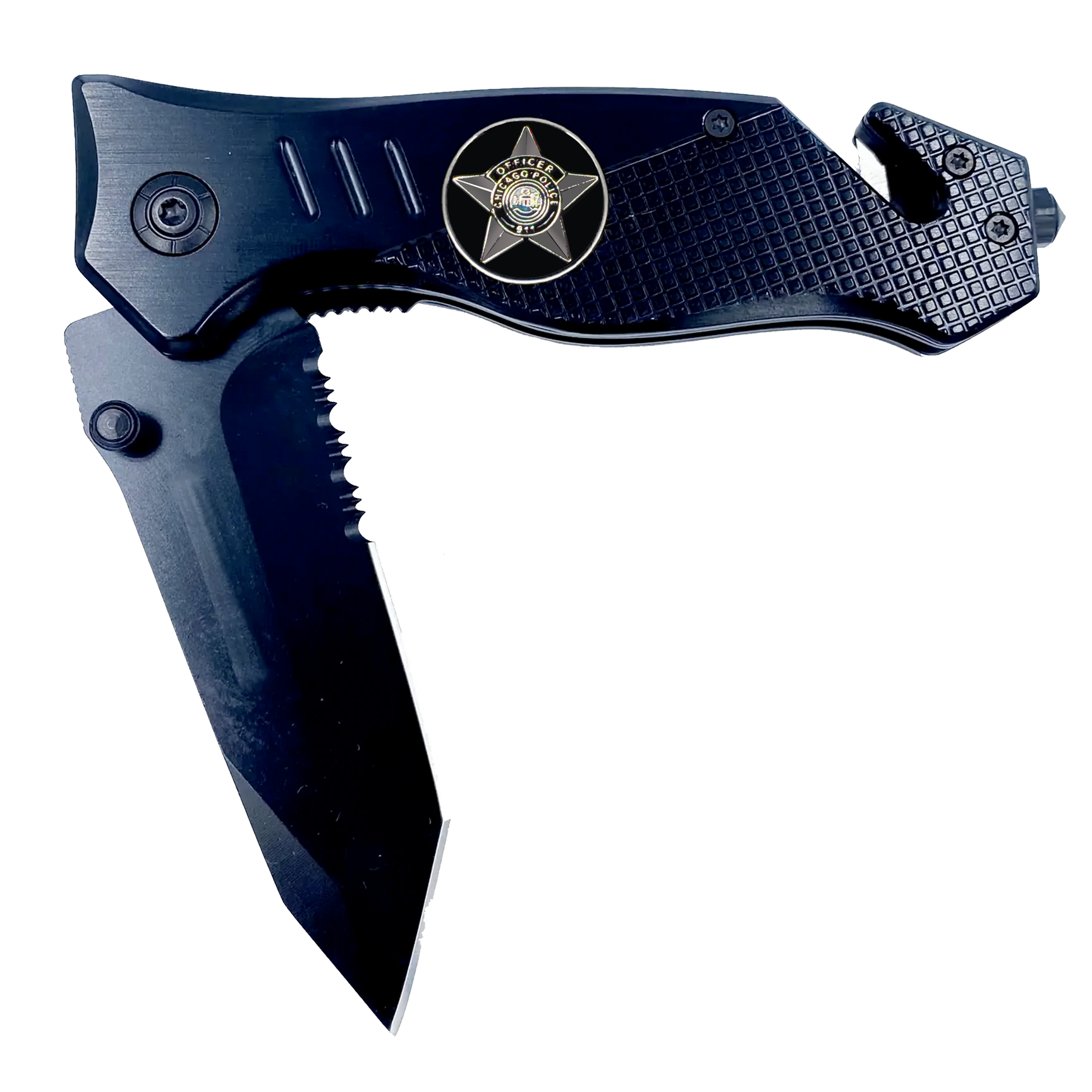 Chicago Police Department CPD 3-in-1 Tactical Rescue knife tool with Seatbelt Cutter, Steel Serrated Blade, Glass breaker