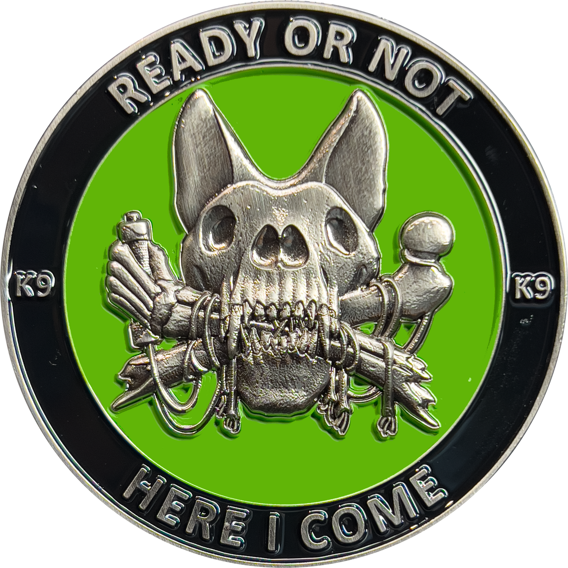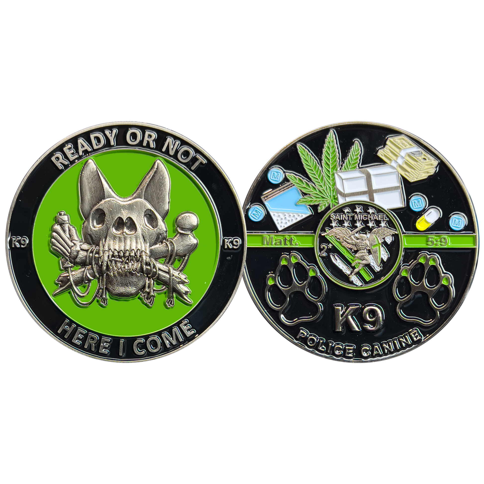 Large 2.5 inch challenge coin with raised 3D K9 skeleton on front. Matthew 5:9 on back wit Saint Michael and thin green line flag. ULMG-3493