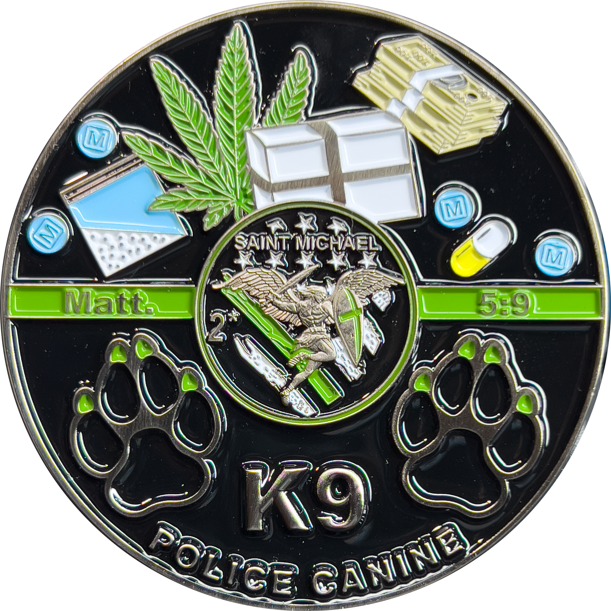 BL6-007 Border Patrol K9 Challenge Coin Canine Unit Saint Michael Thin Green Line Prayer Paw Prints