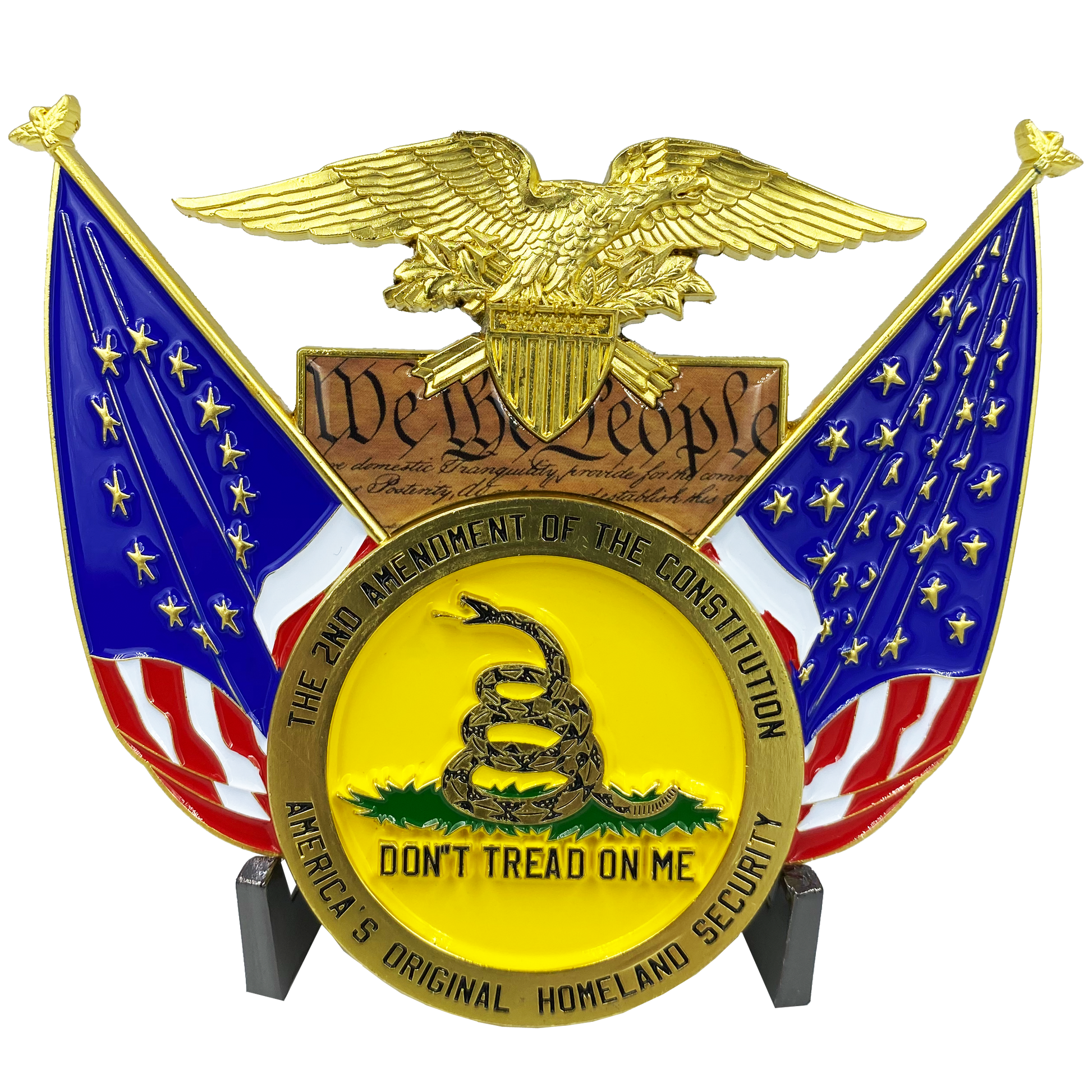 Very large 4.5 inch 2nd Amendment Medallion weighs over half a pound and is more than a quarter inch thick. Display stand sold separately. This requires a large size stand. Don't Tread on Me, We The People, Betsy Ross. ULMG-1272