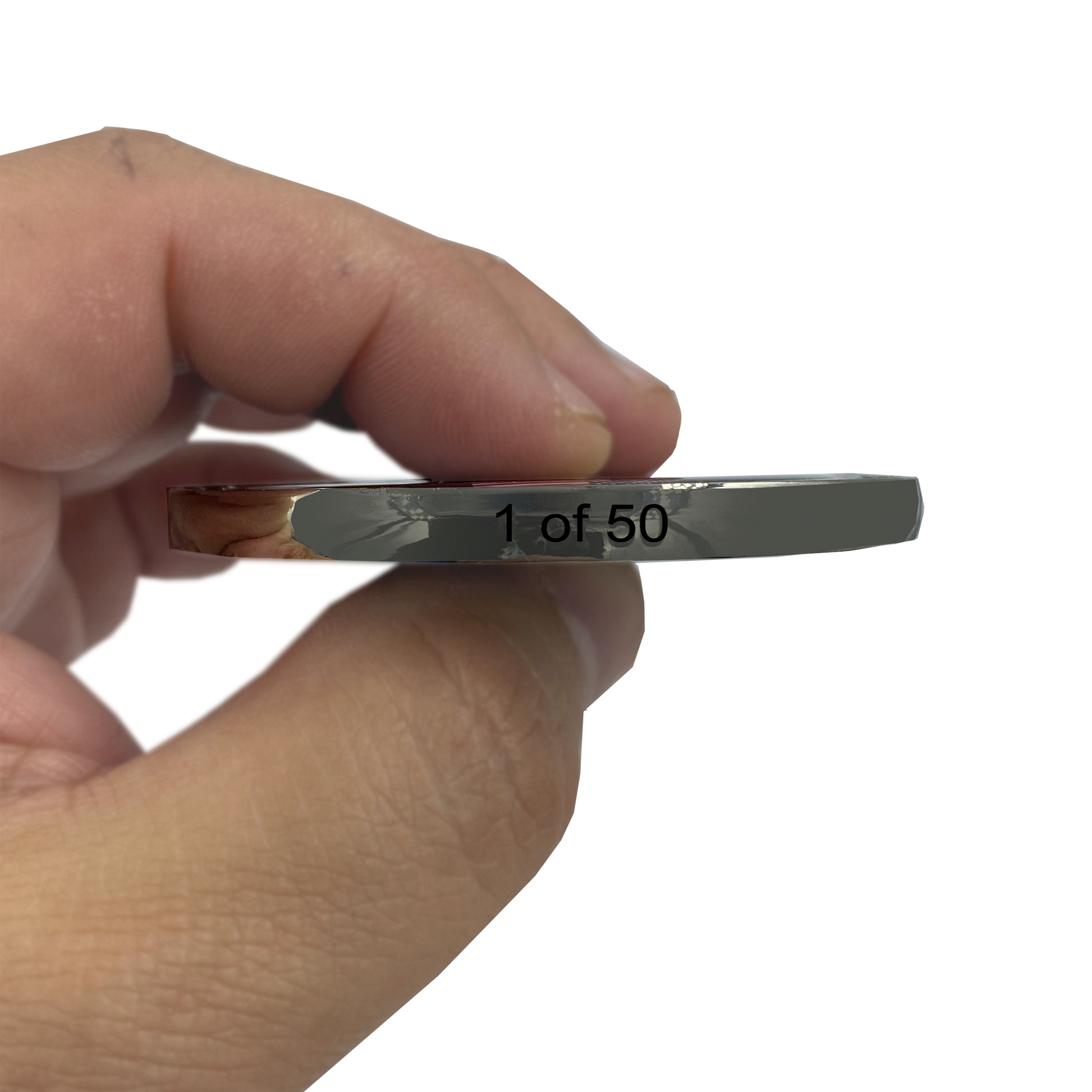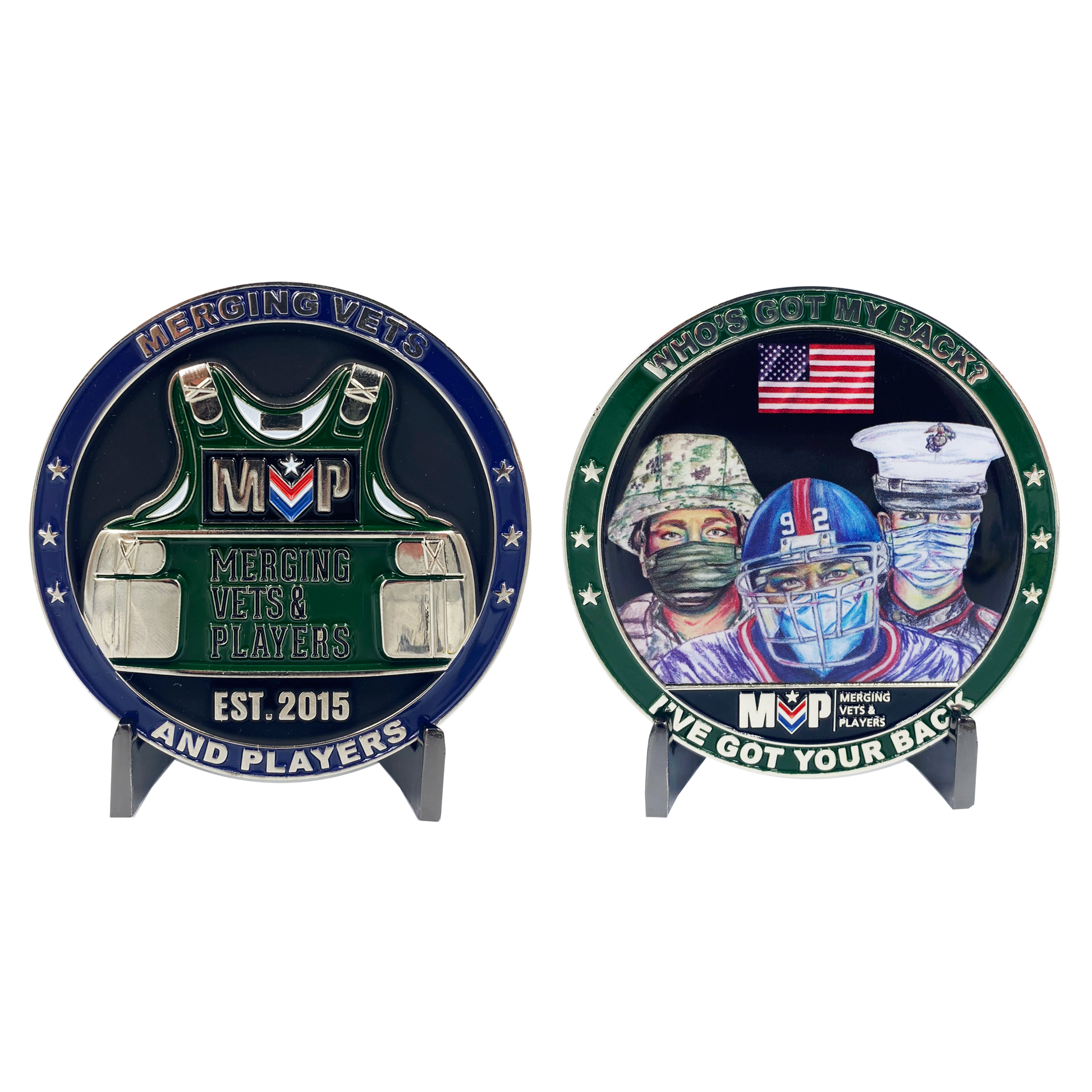 This 2.5 inch limited edition challenge coin was created for Merging Vets and Players and 100% of all proceeds will be donated to MVP. Featuring original artwork created by Kristi Nelson artfully placed on this masterpiece with our Patented Body Armor Medallion. Each coin is individually serial numbered and only 50 challenge coins were produced. Display stands are sold separately. 100% of proceeds donated
