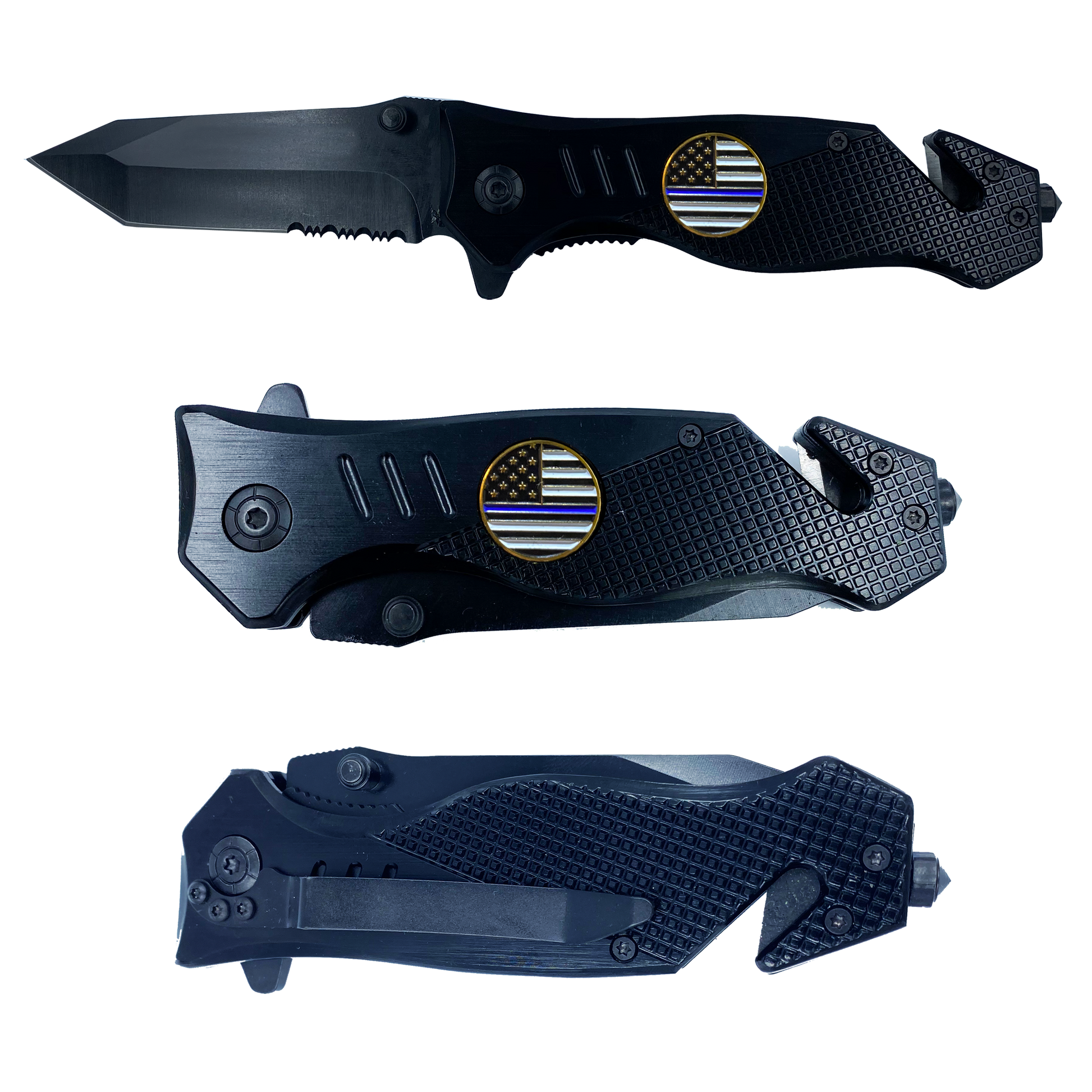 Thin Blue Line 3-in-1 Tactical Rescue knife tool for Police Officers with Seatbelt Cutter Steel Serrated Blade Glass Breaker Deputy Sheriff