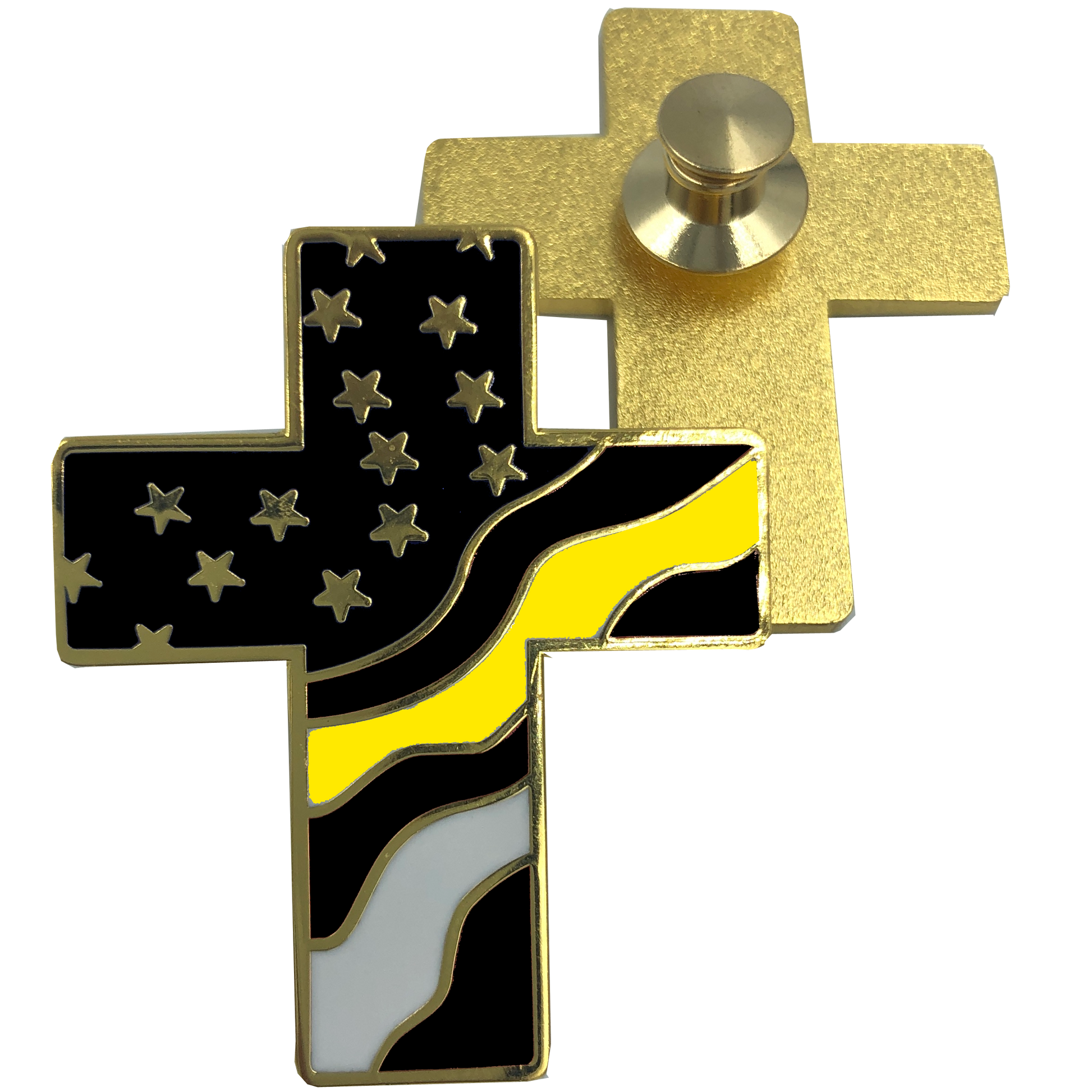 Thin Gold Line American Flag Cross USA Lapel pin Cloisonné 911 Dispatcher Emergency Yellow