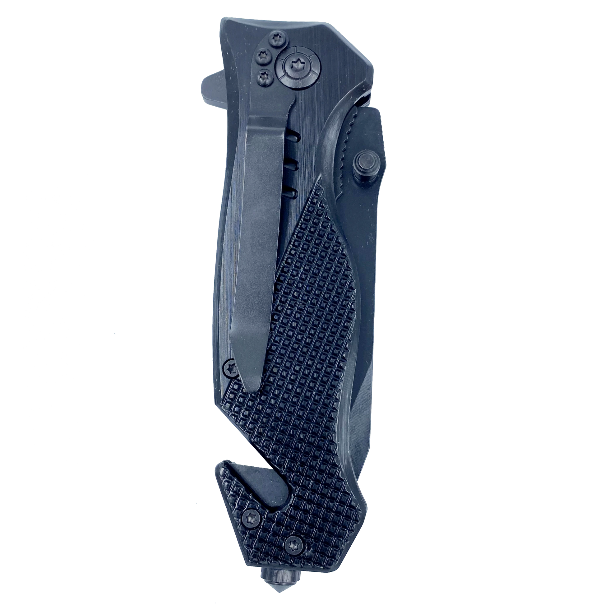 The knife features a steel blade with an aluminum handle and a pocket clip. It weighs 5.2 oz. This rescue tool features a built-in seatbelt cutter, stainless steel knife blade, and glass breaking tip. The stainless steel blade is 3.5 inches and 3mm thick. It has a 4.75 inch closed length and fits in EMT holsters. It has a built-in safety lock and hand grip for emergency situations and rescue.
