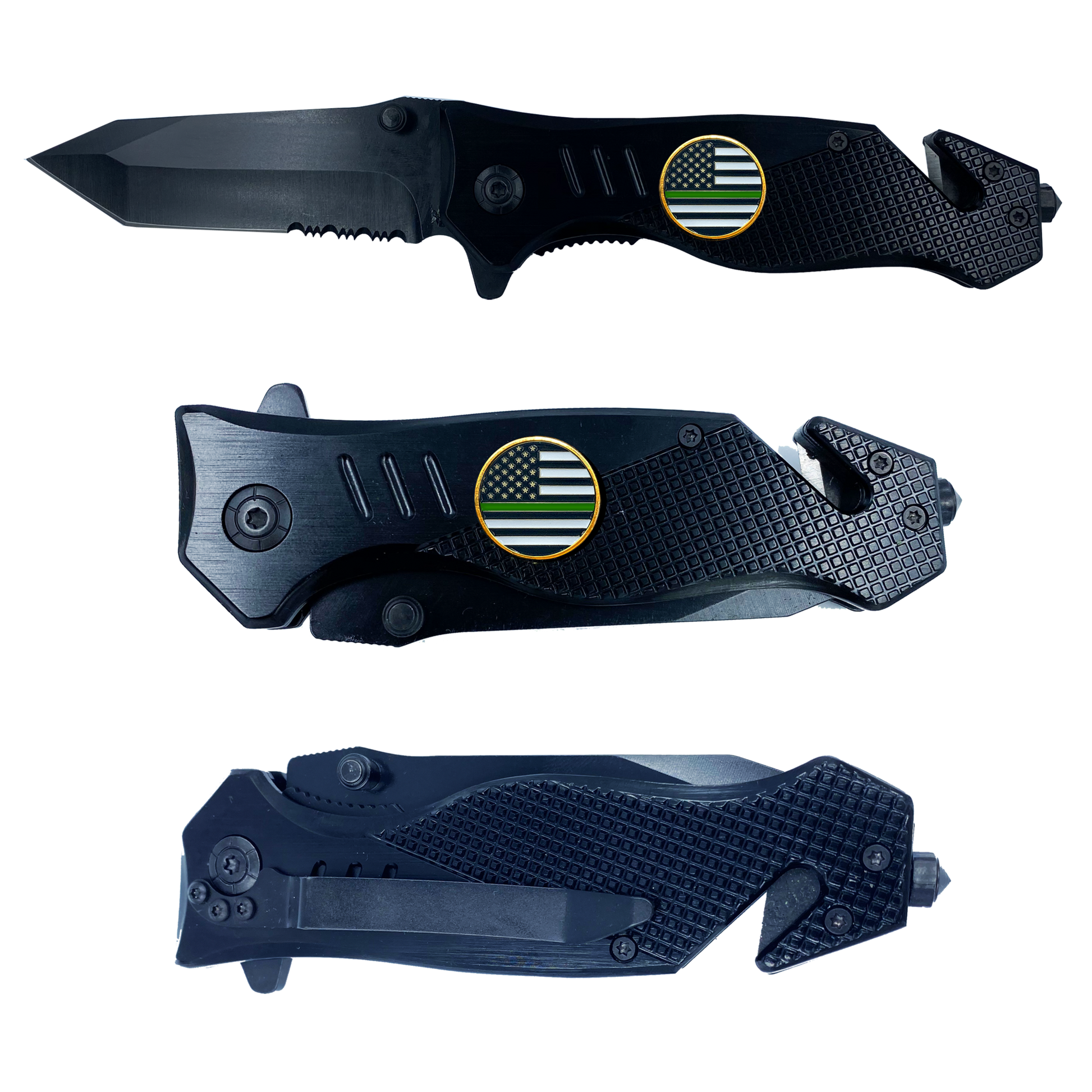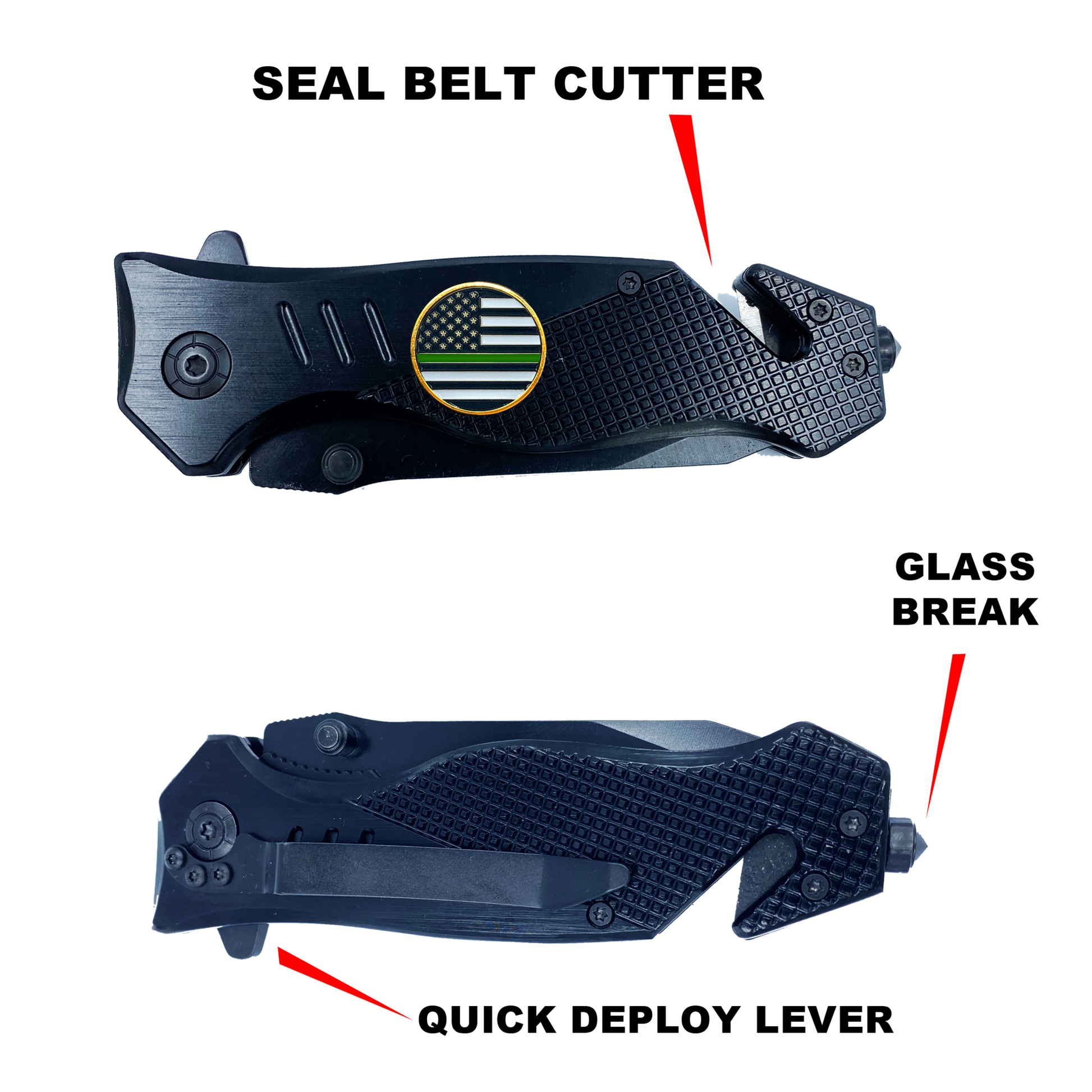 Thin Green Line Police collectible 3-in-1 Tactical Officer Rescue knife tool with Seatbelt Cutter, Steel Serrated Blade, Glass Breaker Border Patrol Army Marines Deputy Sheriff BPA CBP