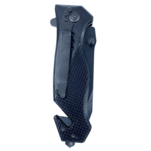 The knife features a steel blade with an aluminum handle and a pocket clip. It weighs 5.2 oz. This rescue tool features a built-in seatbelt cutter, stainless steel knife blade, and glass breaking tip. The stainless steel blade is 3.5 inches and 3mm thick. It has a 4.75 inch closed length and fits in EMT holsters. It has a built-in safety lock and hand grip for emergency situations and rescue.