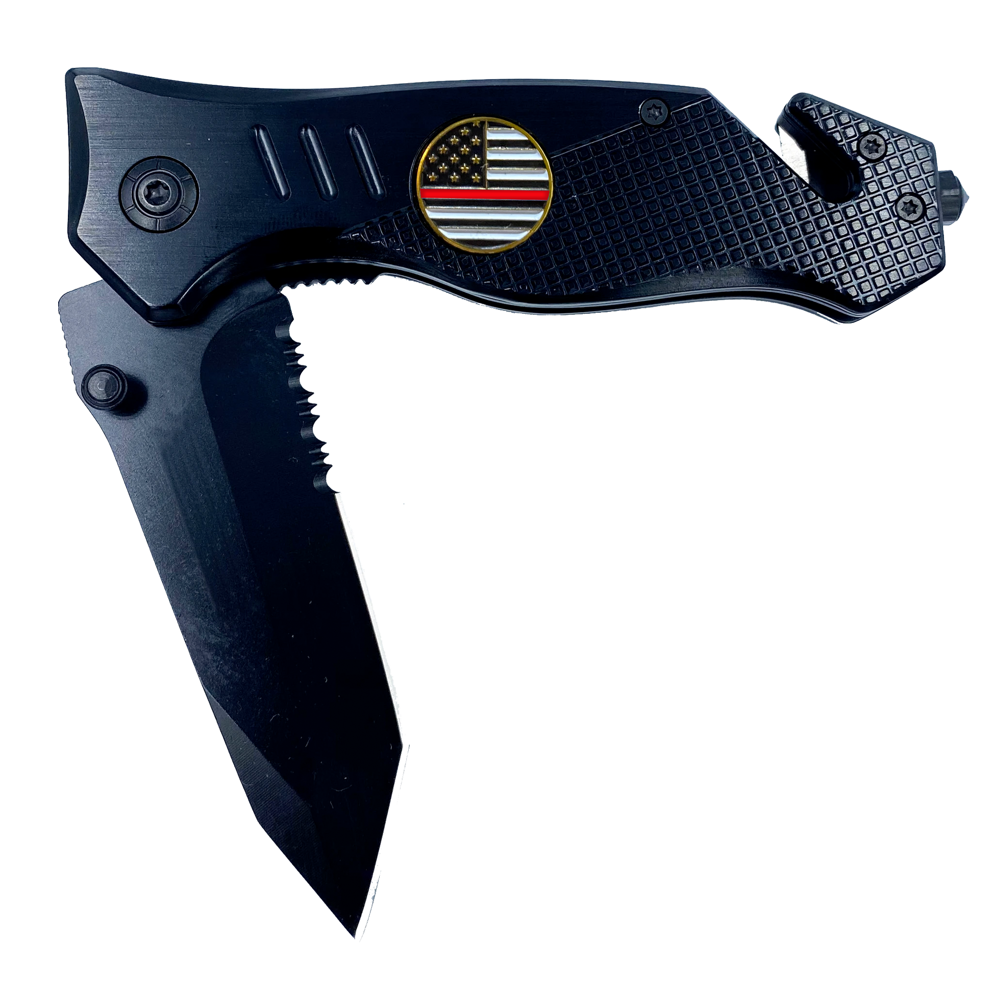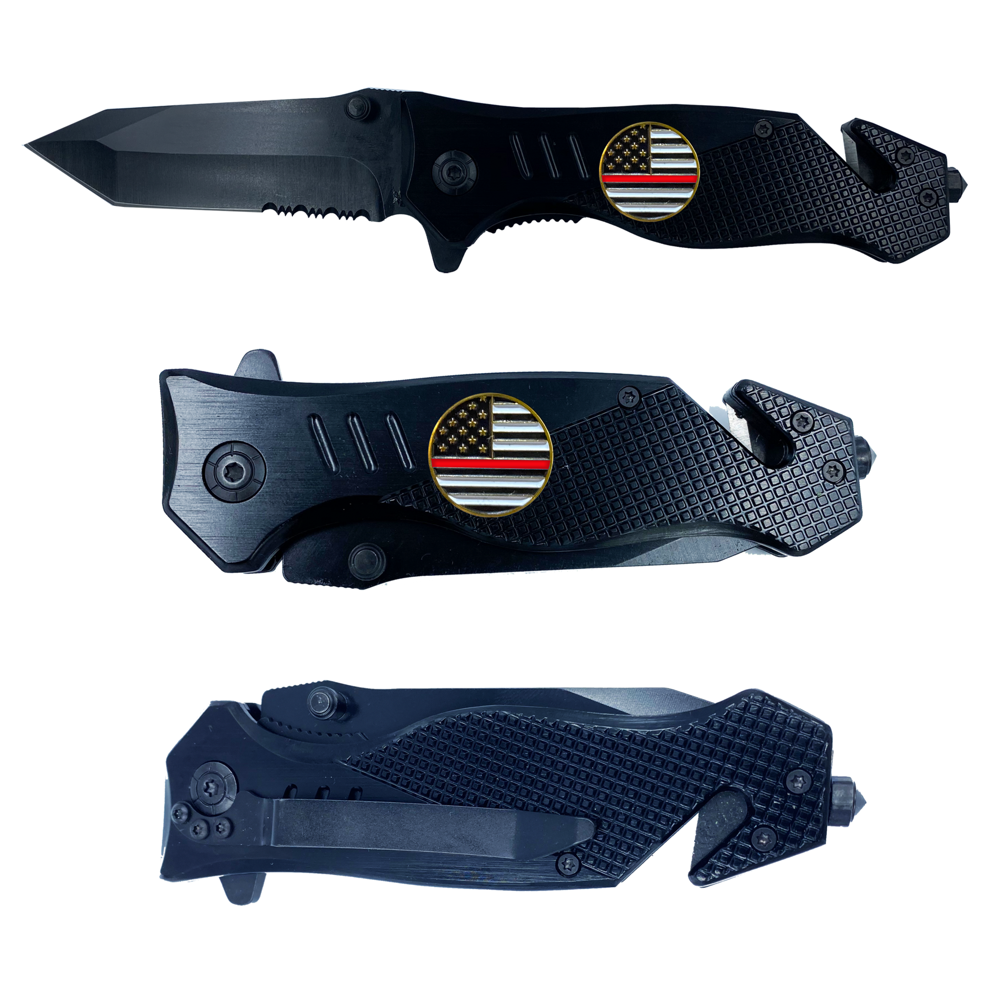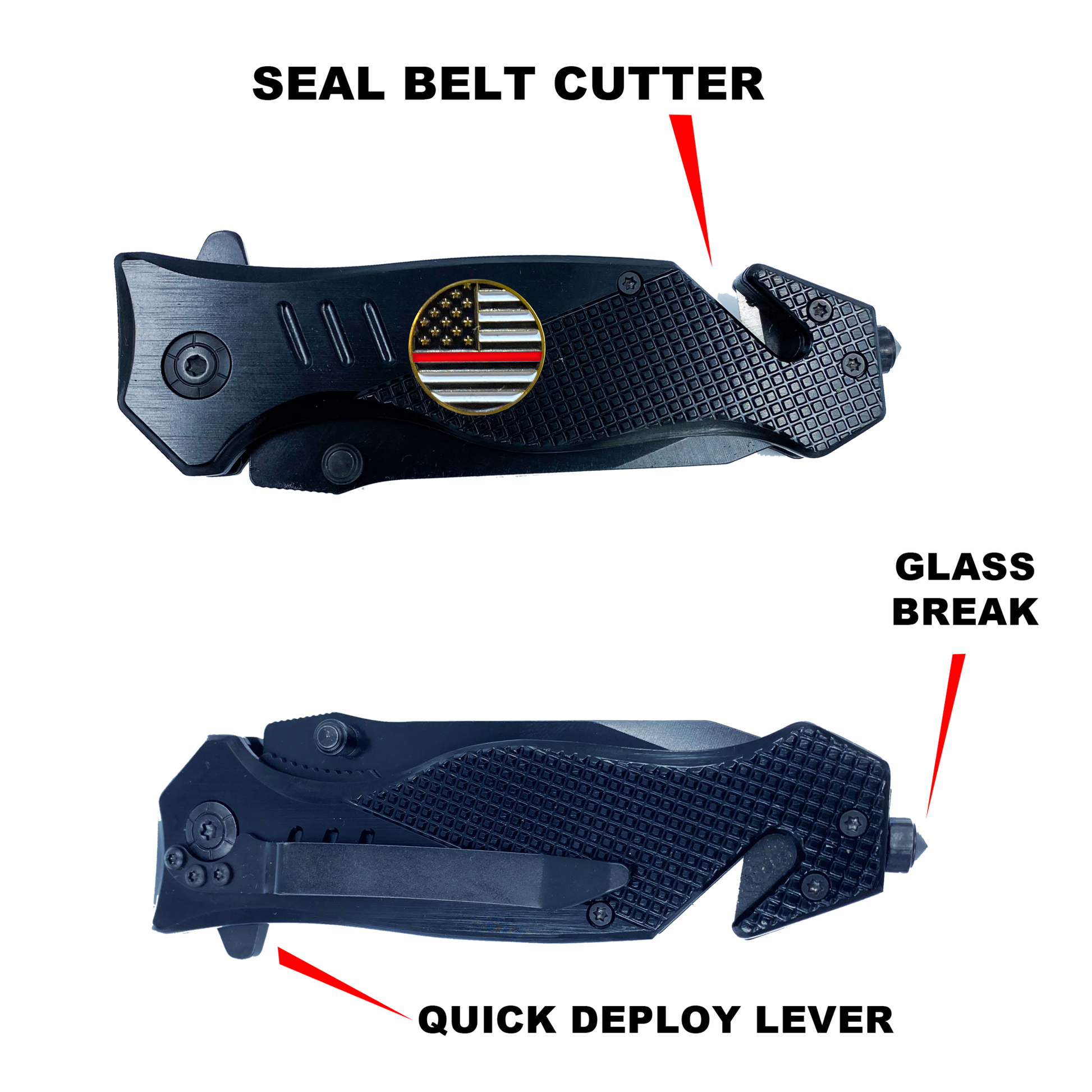 Thin Red Line collectible 3-in-1 Police Tactical Rescue knife tool for Firefighter Fire Fighter Fire Department with Seatbelt Cutter, Steel Serrated Blade, Glass Breaker