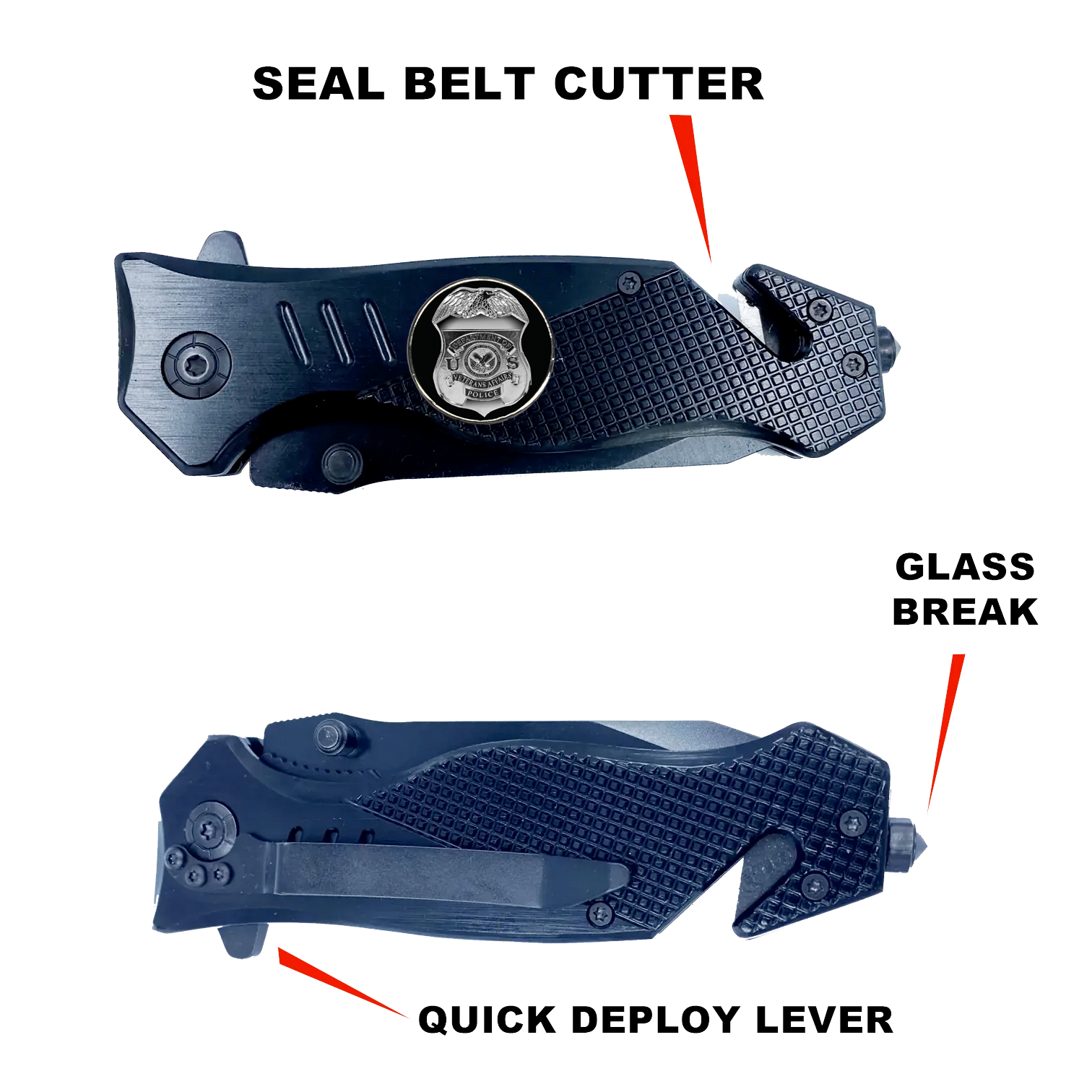 Veterans Affairs VA Police 3-in-1 Tactical Rescue knife tool with Seatbelt Cutter Steel Serrated Blade Glass